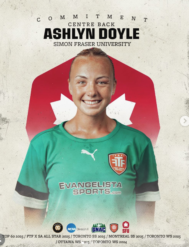 A product of Markham SC, Doyle earned her opportunity through consistent high-level performances across multiple FTF Canada events, including the Top 60 2025, FTF x SA All-Star 2025, Toronto Summer Combine 2025, Montreal Summer Combine 2025, Toronto Winter Combine 2025, Ottawa Winter Combine 2025, and Toronto Winter Combine 2024. These events provided direct exposure to Simon Fraser University staff, who were in attendance identifying top Canadian talent.